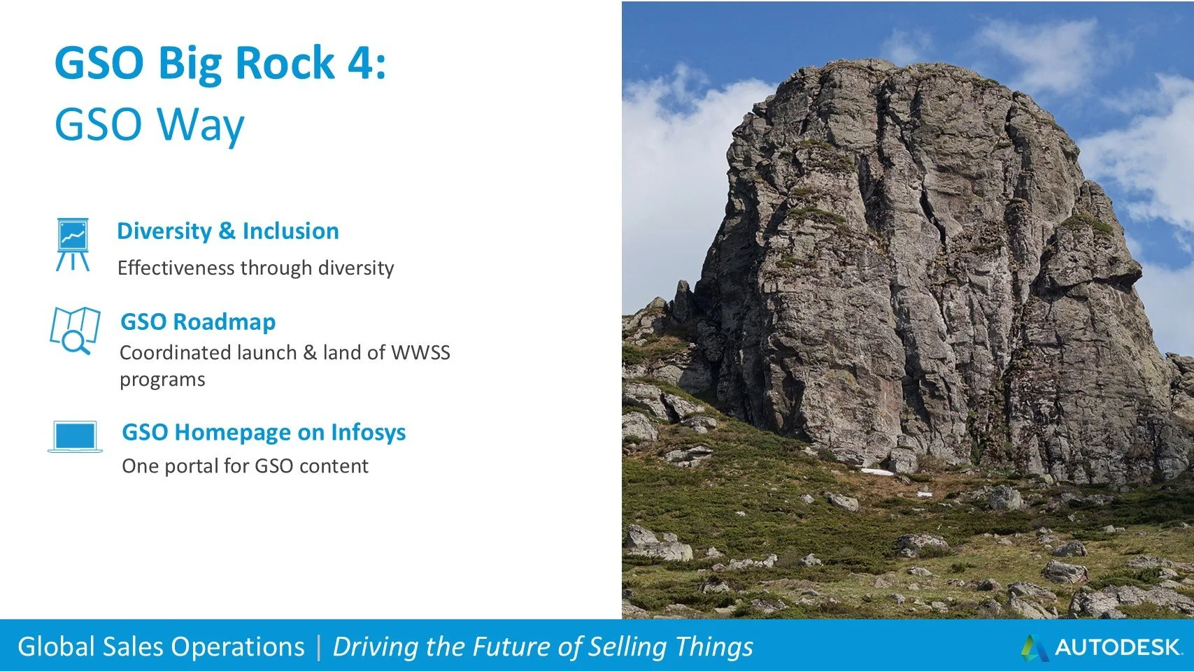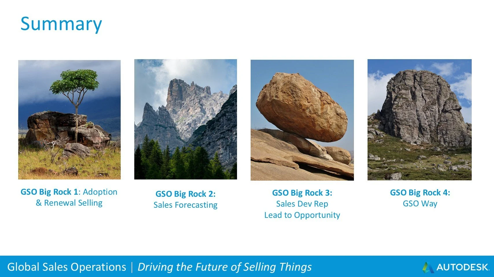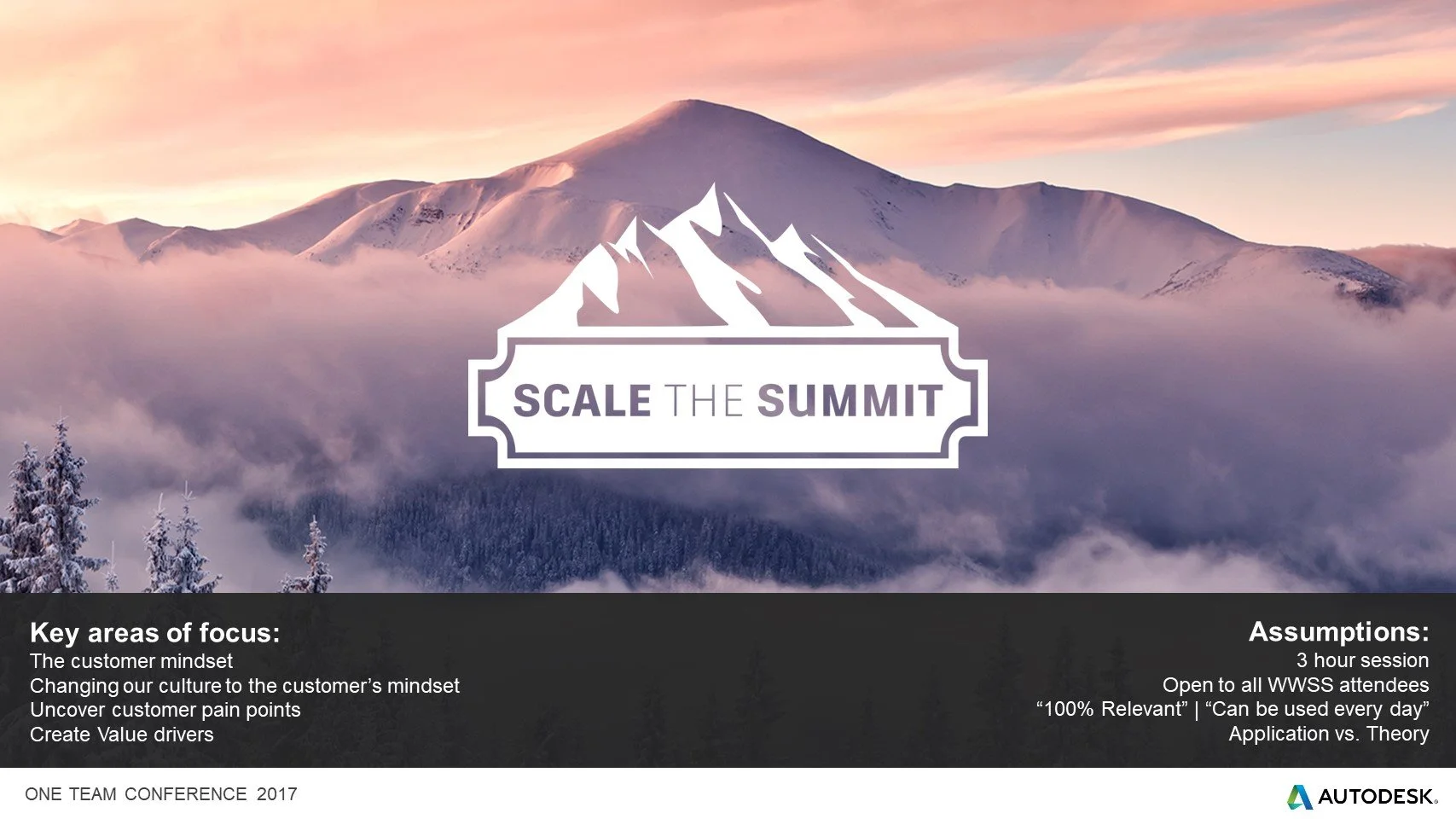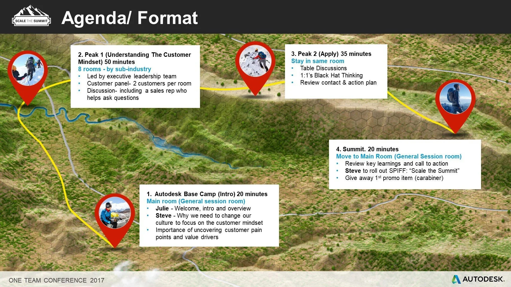 This is a sampling of slide designs I provided for Autodesk’s Scale the Summit and Big Rocks sales executive presentation. It was a workshop open to all sales and sales support staff on the upcoming challenges the business faced.